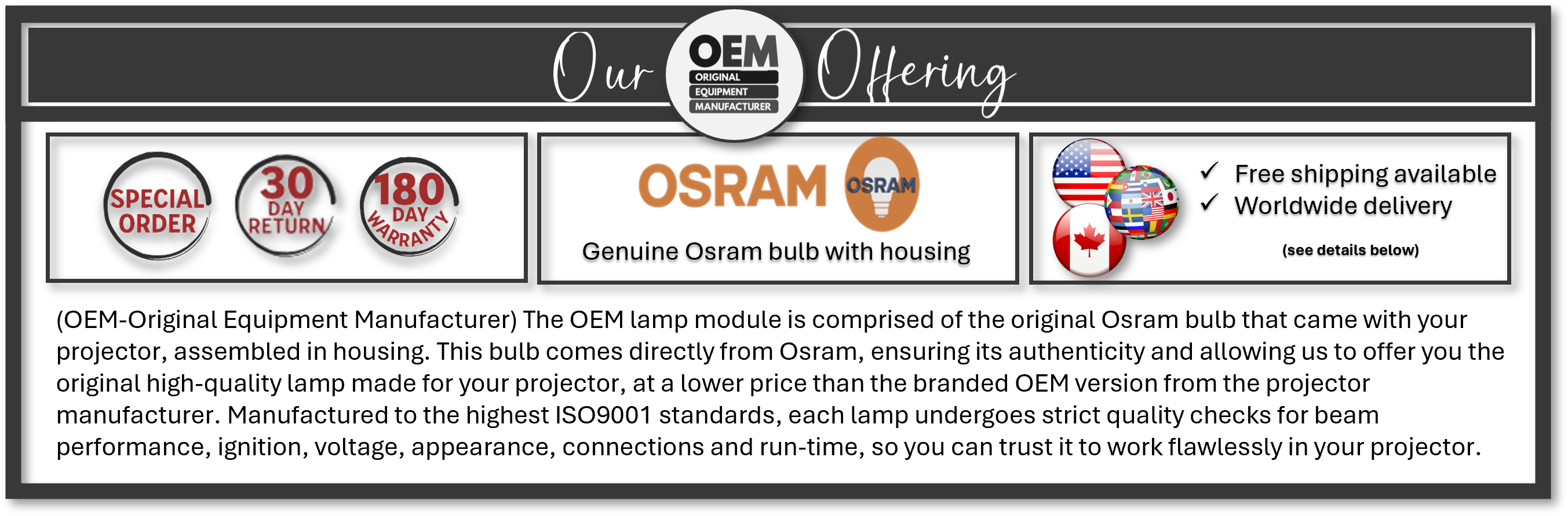 Optimized Compatibility: We only sell true OEM lamps direct from Philips, Osram, Ushio, Phoenix, and Matsushita and genuine compatibles from the top 3rd party manufacturers. Manufactured to the highest ISO9001 standards, you can be assured each lamp has undergone strict quality checks for beam performance, ignition, voltage, appearance, connections and run-time to work flawlessly in your projector.